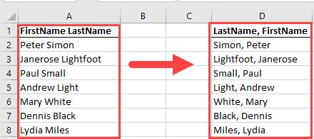 excel switch first and last name without comma