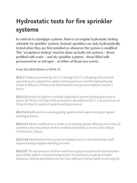 fire sprinkler hydrostatic testing requirements
