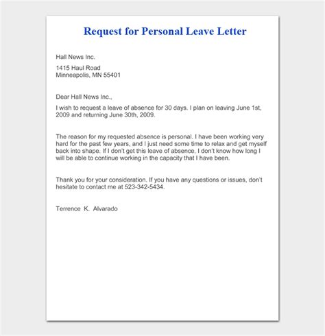 sample of personal leave letter